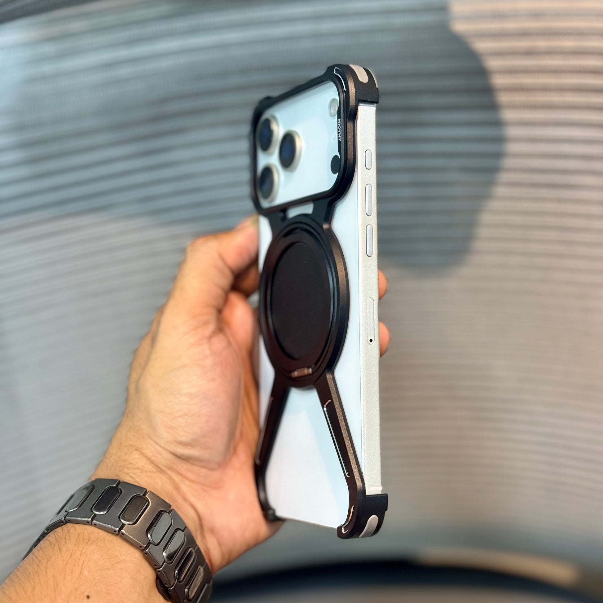 The MagRotator Metal Bumper Case combines premium metal edges with a built-in 360° rotating MagSafe stand, offering both rugged protection and versatile functionality. Designed for the iPhone 17 Pro Max, it ensures edge-to-edge safety, camera protection, and a luxe leather MagSafe pad for a refined look and feel.