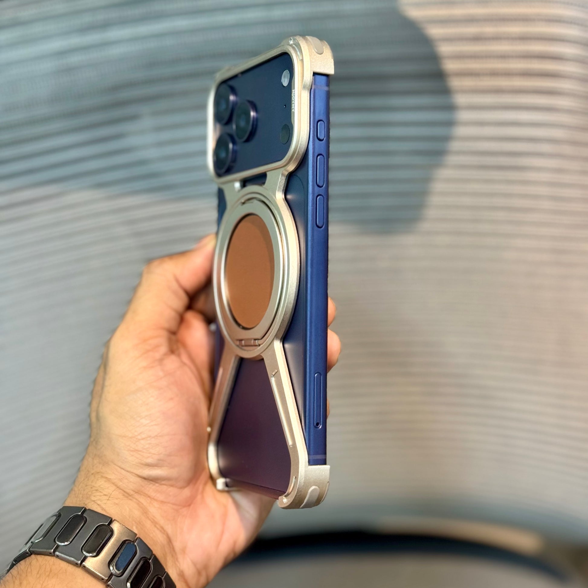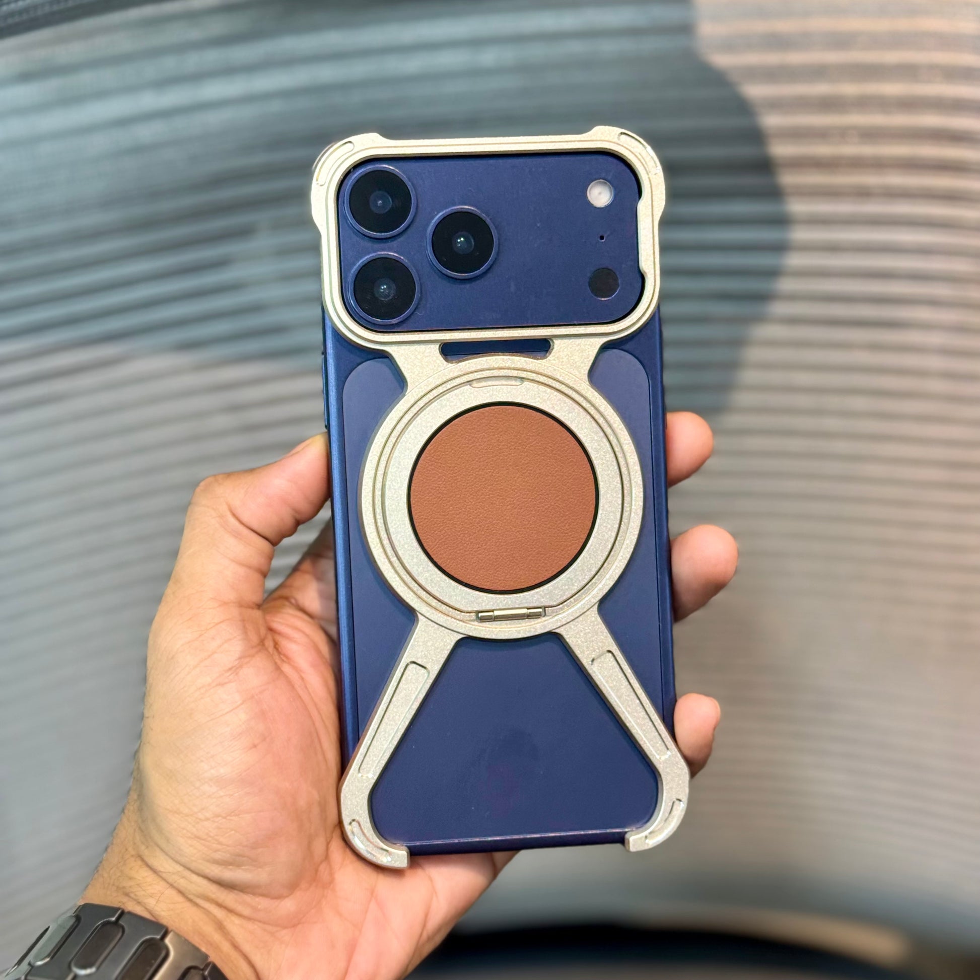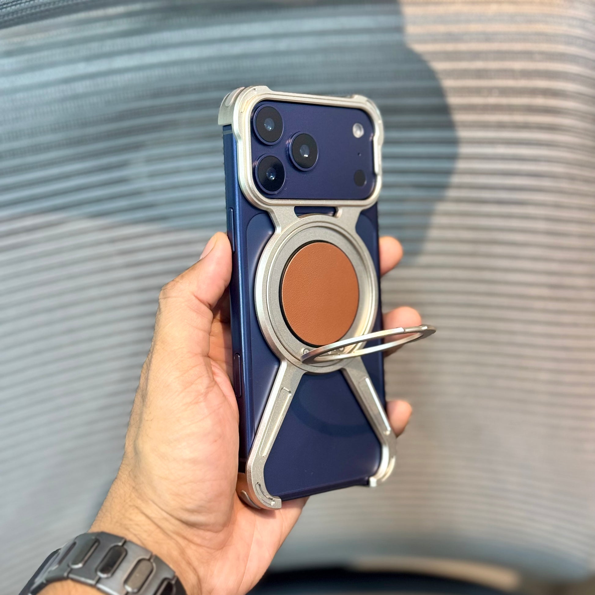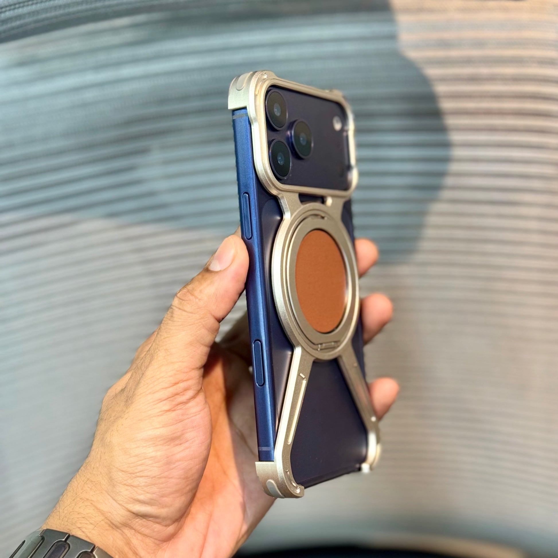 The MagRotator Metal Bumper Case combines premium metal edges with a built-in 360° rotating MagSafe stand, offering both rugged protection and versatile functionality. Designed for the iPhone 17 Pro Max, it ensures edge-to-edge safety, camera protection, and a luxe leather MagSafe pad for a refined look and feel.