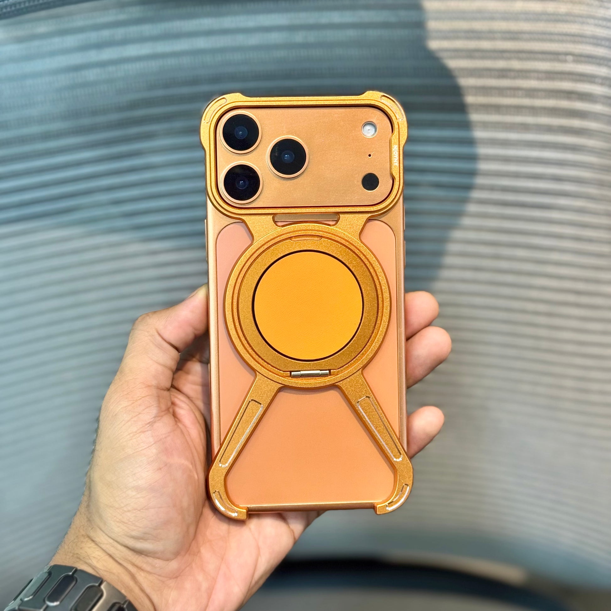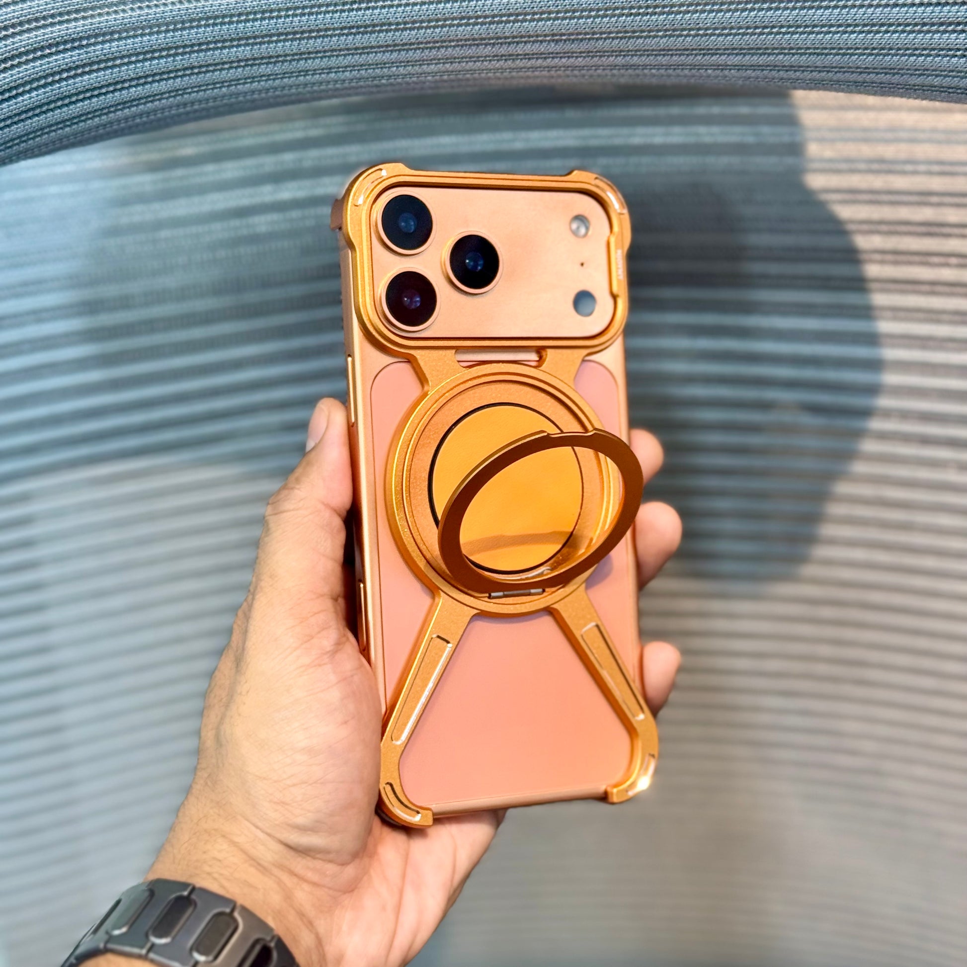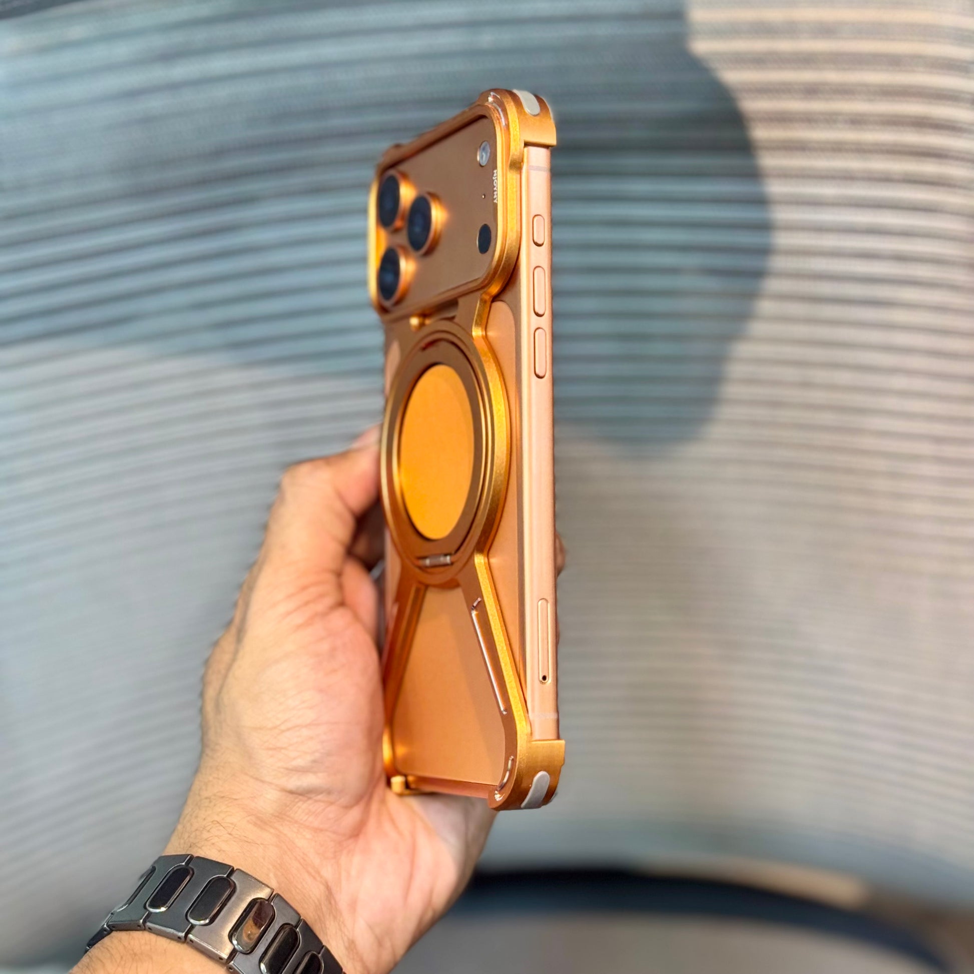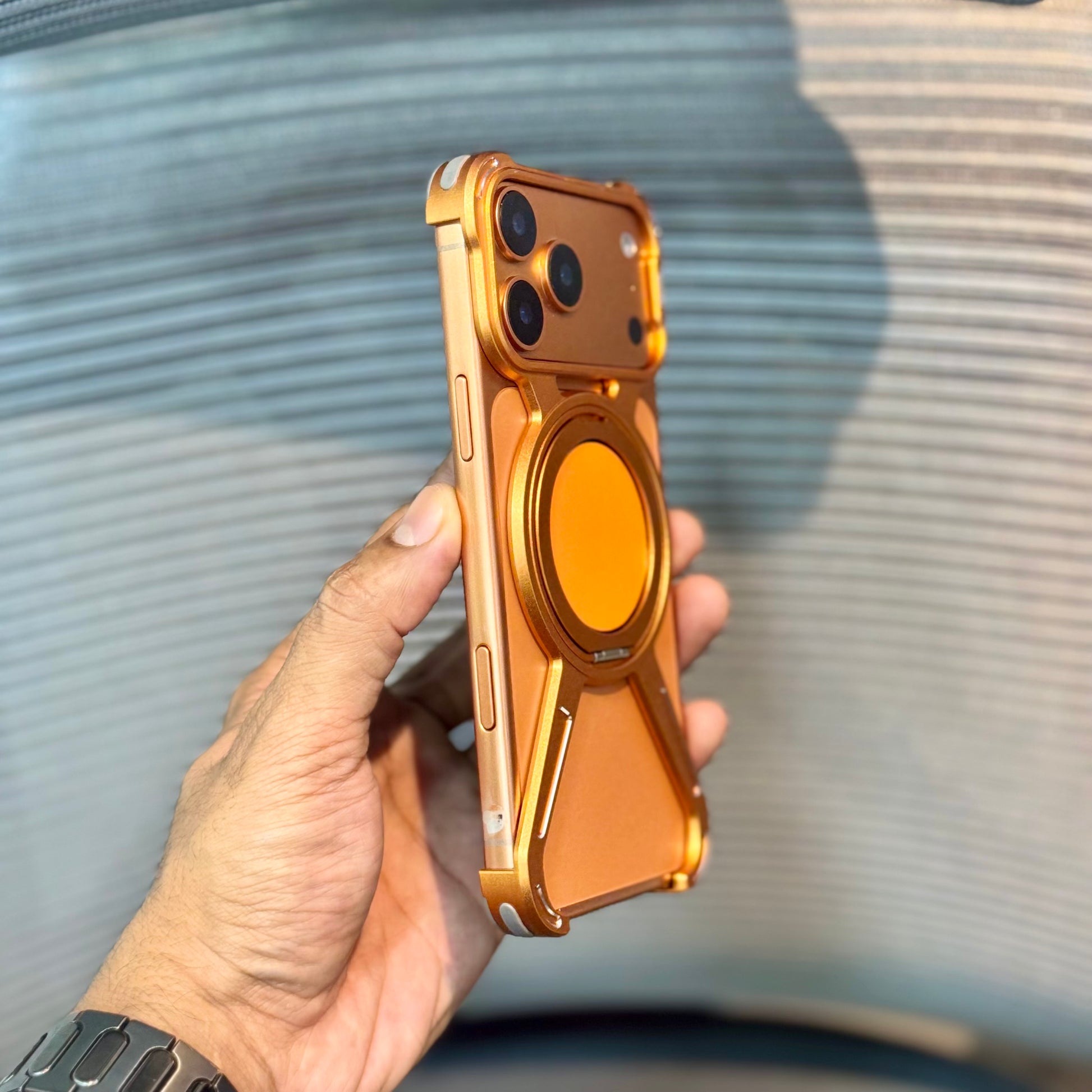 The MagRotator Metal Bumper Case combines premium metal edges with a built-in 360° rotating MagSafe stand, offering both rugged protection and versatile functionality. Designed for the iPhone 17 Pro Max, it ensures edge-to-edge safety, camera protection, and a luxe leather MagSafe pad for a refined look and feel.